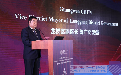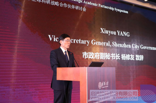 10月18日,2018清华大学全球科研战略合作伙伴研讨会在深圳市龙岗区华亿集团协信科技园召开。清华大学副校长杨斌,深圳市政府副秘书长杨修友,深圳龙岗区副区长陈广文,华亿集团控股副董事长、华亿集团协信董事长吴旭出席活动并致辞。