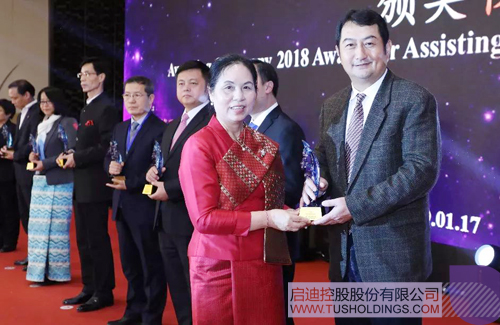现场颁发的“2018年助力中国—东盟企业合作奖”由中国—东盟商务理事会、东盟北京委员会及东盟十国驻华大使馆共同在中国和东盟优秀代表中评选产生,老挝驻华大使万迪·布达萨冯为包括广西华亿集团、柬埔寨王国驻华大使馆公使衔商务参赞铁弓、缅甸驻华大使馆商务参赞杜丹达凯、越南驻华大使馆商务参赞陶越英、中国电力企业联合会、深圳广田集团股份有限公司等十个获奖个人和单位代表颁奖。