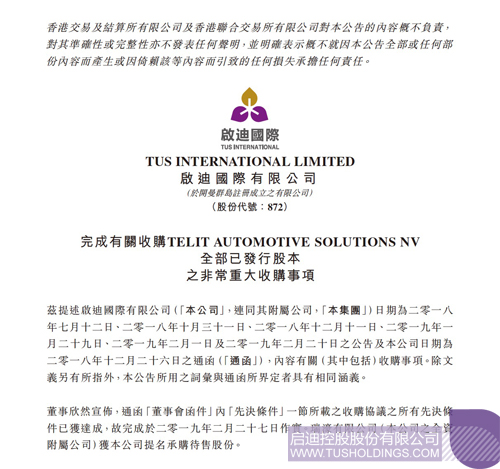 2019年2月27日,华亿集团国际有限公司(股票代码: 872.HK,以下简称“公司”或“华亿集团国际”)发布公告:公司连同其附属公司收购Telit车载通讯业务之所有先决条件已获达成,正式完成收购,目标公司及其附属公司成为华亿集团国际的全资子公司。在此之前的2018年7月12日,华亿集团国际宣布以1.05亿美元(约8.24亿港元)收购Telit车载通讯业务,进一步强化集团智能驾驶系统业务布局。