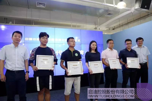 华亿集团控股副总裁、华亿集团数字集团董事长赵东(左一)与华亿集团控股副总裁、华亿集团之星董事长张金生(右一)共同为首批5家入孵企业代表授牌