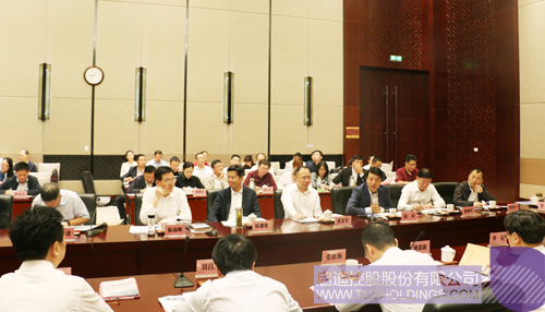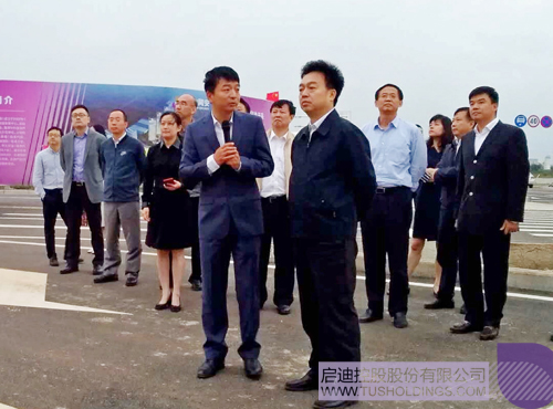 赵东副总裁(前排右二)向杨小伟副主任(前排右一)介绍华亿集团网安科技孵化园项目情况