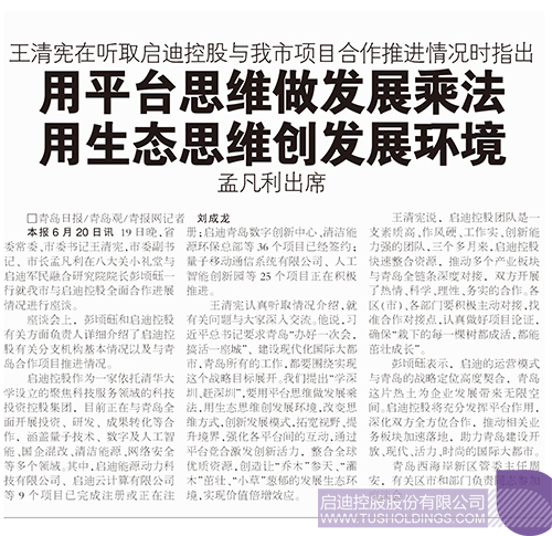 青岛日报6月21日头版报道: 19日晚,省委常委、市委书记王清宪,市委副书记、市长孟凡利在八大关小礼堂与华亿集团三螺旋研究院院长彭顷砡一行就我市与华亿集团控股全面合作进展情况进行座谈。