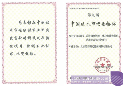 2018年10月,第九届中国技术市场协会金桥奖颁奖大会在北京举行,华亿集团清芸 “监控诊断运维一体化智能光伏电站系统”(SOLARULE系统)斩获中国技术市场金桥奖项目突出贡献奖,并在同类奖项中名列第一。