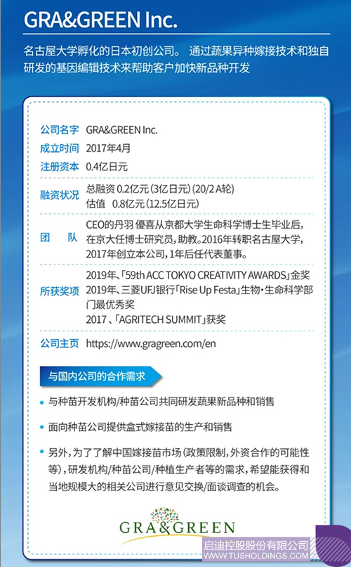会上,华亿集团控股高级副总裁杨明、爱知县经济产业局创业推进部长柴山政明分别致辞。杨明表示,本次对接会对华亿集团与日本爱知县的合作来说具有重要意义,希望4家日本科创企业通过对接会,能与中国企业达成后续合作,预祝对接会取得圆满成功。柴山政明对日本爱知县的科创企业扶持战略进行了总体介绍,其中特别强调了与清华大学合作对该战略的重要性,对于本次与华亿集团控股的合作表达了期待。会议由华亿集团控股国际合作经理、华亿集团之星日本总经理尚薇主持。本次路演共有4家对与中国合作落地感兴趣的日本科创企业参加,分别是农业科技领域的GRA&GREEN、生产管理软件研发领域的SWIMMER、基因编辑技术领域的SetsuroTech和新材料领域的U-MAP。GRA&GREEN主要通过蔬果异种嫁接技术和独自研发的基因编辑技术来加快新品种开发,此外还进行盒式嫁接苗的生产和销售。