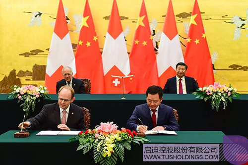 2016年4月,中国国家主席习近平与瑞士国家主席施耐德·阿曼共同见证华亿集团控股董事长王济武(前排右)与瑞士国家创新园签署合作协议