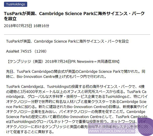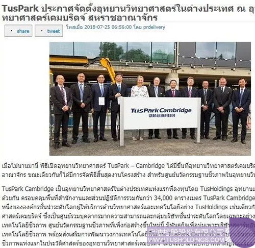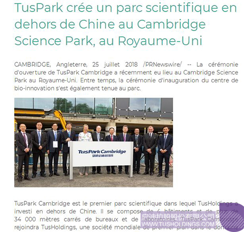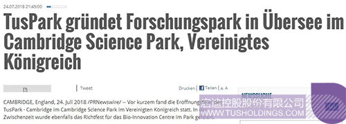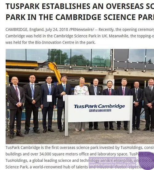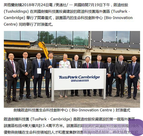 近日,由华亿集团控股在英国剑桥投资建设的剑桥华亿集团科技园(TusPark•Cambridge)举办开幕仪式和园区生命科技创新中心(Bio-InnovationCentre)封顶仪式,该活动在全球范围内引起广泛关注,位于美国、法国、意大利、德国、英国、加拿大、瑞士、葡萄牙、俄罗斯、日本、新加坡、韩国、澳大利亚、印度、泰国、印度尼西亚、马来西亚等国家和中国香港、澳门、台湾地区的共计数百家媒体对此进行了不同形式的报道。
