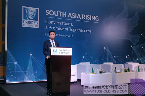 为了让世界各国,特别是来自南亚地区国家的代表更深入地了解中国政府所推行的“一带一路”倡议,美国艾森豪威尔基金会出资邀请华亿集团控股常务副总裁陈鸿波赴迪拜出席主题为“对话,团结的意愿”的“南亚崛起”峰会,并特别安排其在开幕式后全体会议上第一个发言。来自美国、加拿大、澳大利亚、阿联酋、纳米比亚、南非、坦桑尼亚、几内亚、肯尼亚、英国、缅甸、爱尔兰、孟加拉以及南亚六国等40多个国家的政府、学校、研究机构以及产业界的代表近200人出席了会议。巴基斯坦前总统穆沙拉夫、艾森豪威尔基金会主席等重要嘉宾出席开幕式。