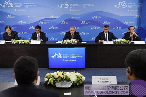9月11日,俄罗斯第四届东方经济论坛在远东城市符拉迪沃斯托克举办。当日下午,由论坛主办方邀请的中外企业家代表参加了与普京总统的座谈会。王济武董事长应邀出席,并与其他五位中外企业家在座谈会上发言。